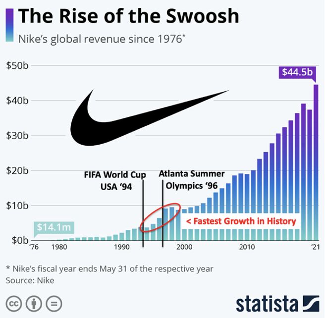 Thirty years ago, Nike experienced the fastest growth in its history and two major events took place in the US.